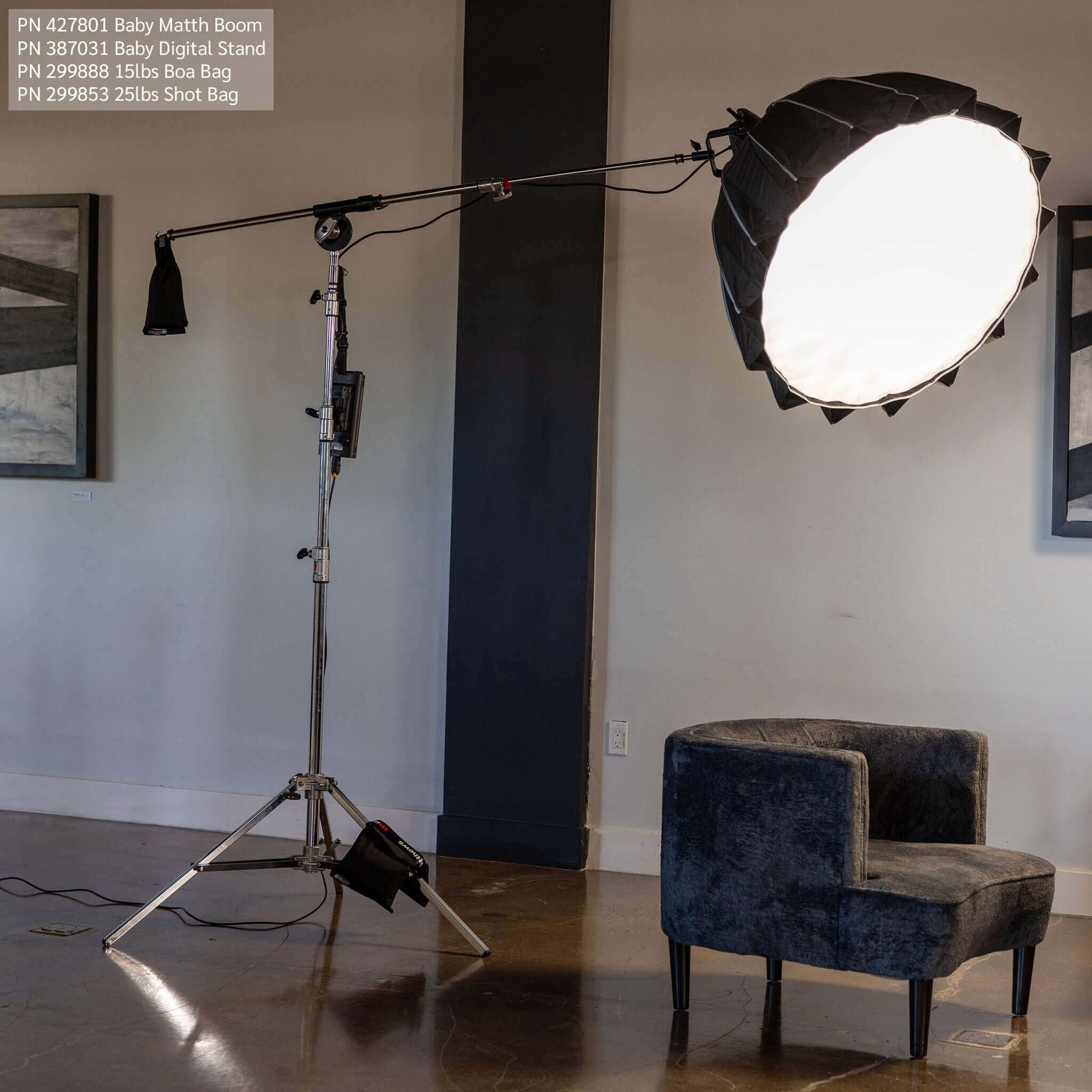 CAUTION: Any light boom that is not properly balanced is extremely dangerous on a set. When calculating the proper stand on which to attach the boom, be sure to include the amount of counter weight in addition to the lighting fixture and accessories being used.